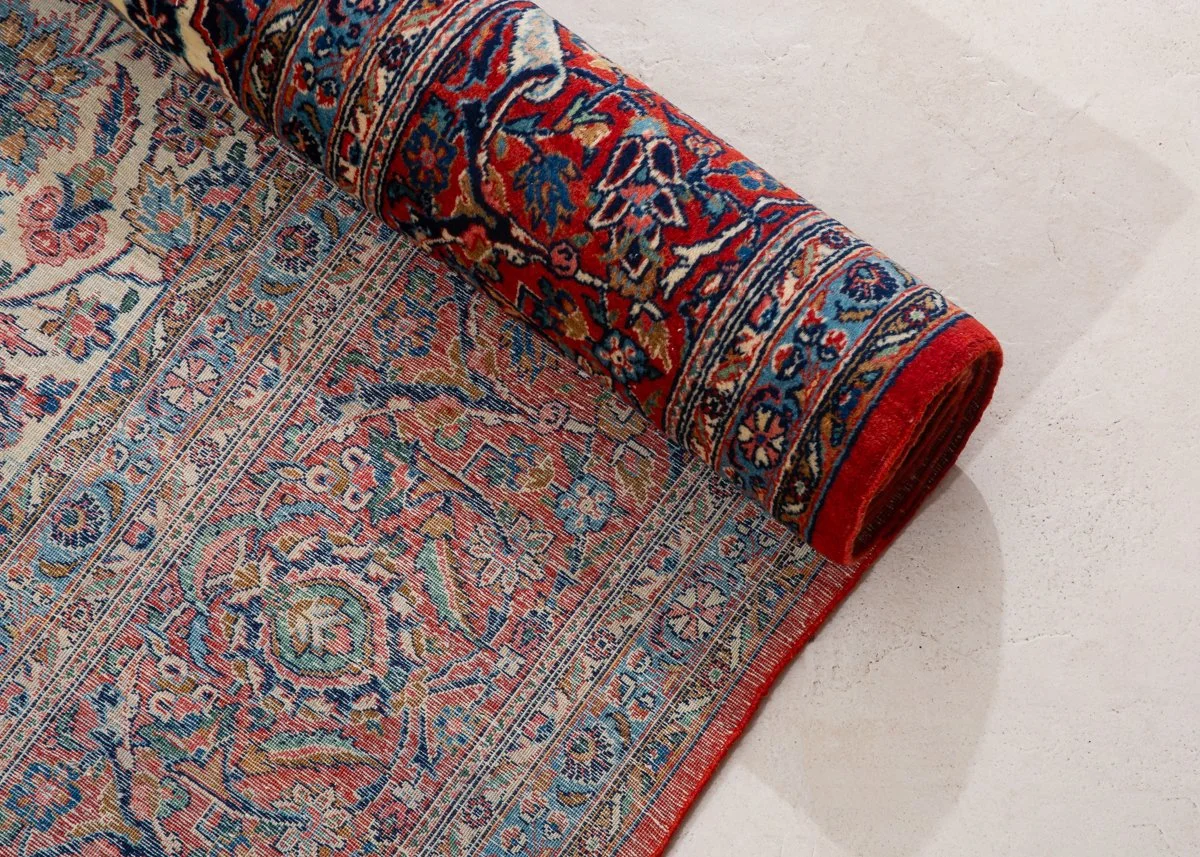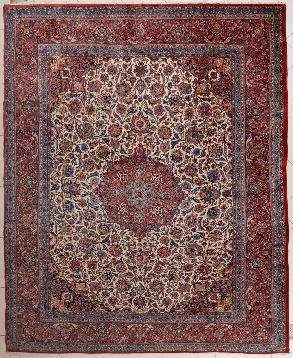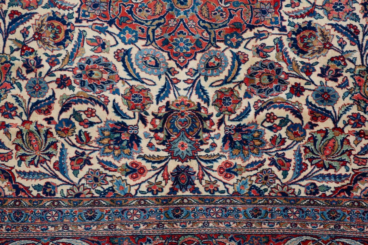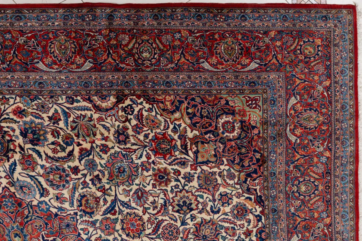 A glorious full size Kashan made from the softest wool. Woven in the nineteen twenties it is in perfect condition and has had very little wear. The ivory background enhances the beauty of the design as the floral celebration is set within a complex series of three frame that each have their own particular joyous movements. This carpet is alive.